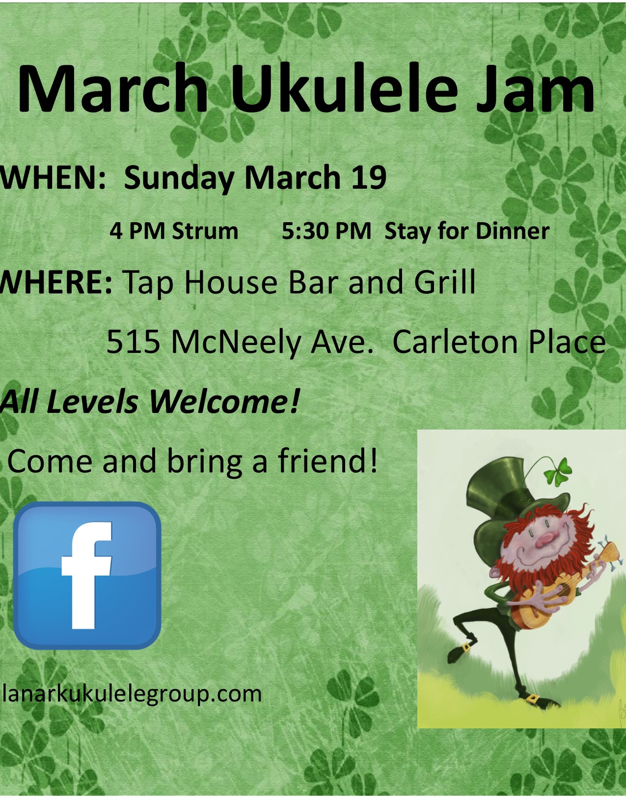 March 19th Uke Jam – Hope to See You There in Green! Posted byUkulele AdministratorFebruary 19, 2017February 19, 2017Posted inUncategorizedTags:Carleton Place, jam, lanark, Perth, smiths falls, ukulele Join us on the 19th Discover more from Lanark Ukulele Group (LUG) Subscribe to get the latest posts sent to your email. Type your email… Subscribe Share this: Click to share on X (Opens in new window) X Click to share on Facebook (Opens in new window) Facebook Click to share on Pinterest (Opens in new window) Pinterest Click to email a link to a friend (Opens in new window) Email Like Loading... Published by Ukulele Administrator We are a group of Ukulele players who enjoy getting together to play and sing. We focus on fun and enjoyment. Great for beginners and experienced players - all skill levels are welcome. View more posts
